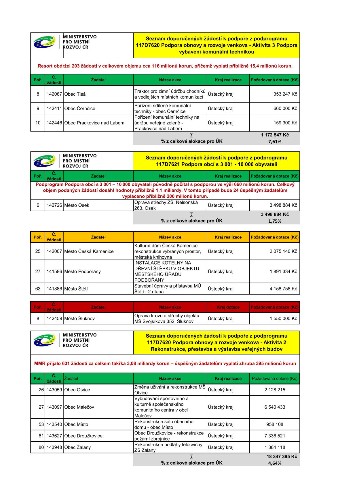 V Ústeckém kraji byly podpořeny projekty obcí napříč programy ve výši cca 23 mil. Kč, což činí z celkové výše uvedené alokace 3, 77 %, což v kontextu celkově alokovaných prostředků nejsou zcela lichotivá čísla.