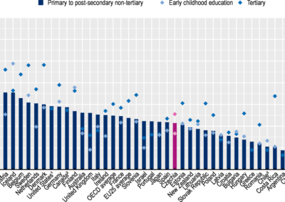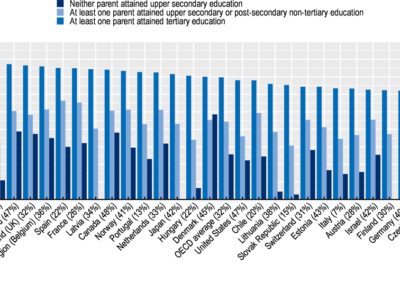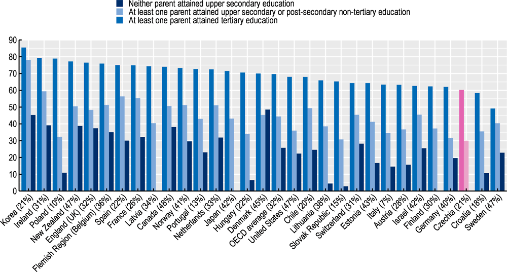 Z dat OECD rovněž vyplývá, že vzdělání rodičů má zásadní vliv na to, zda děti úspěšně dokončí vysokou školu. Pokud má alespoň jeden rodič terciární vzdělání, dosahuje tohoto stupně vzdělání 60 % mladých lidí. U dětí rodičů se středoškolským vzděláním je to pouze 30 %.